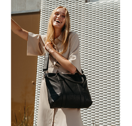 Ravenna skuldertasken i sort læder er både stilren og praktisk. Denne taske er en god og populær arbejdstaske og hverdagstaske, da den har en stor rummelighed. Der er i den flotte taske plads til en 15” computer samt Apple 16" Macbook Pro laptop. Tasken har i alt tre lommer med lynlås. To er placeret indeni tasken, hvor du kan opbevare værdigenstande. Den tredje lomme er placeret udenpå tasken med en skjult lynlås. Den moderne dametaske har to hanke samt en aftagelig og justerbar skulderrem.